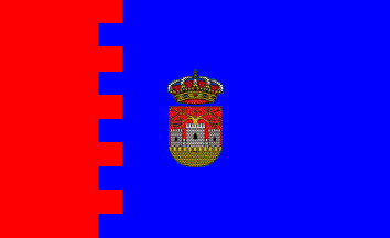 Flag: Rectangular, in proportions 11 x 18, vertically divided (1:4) by an embattlement of five pieces, first, red, and second, blue. Charged in the center with the local coat of arms.