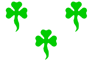 White flag with three green "tailed" trefoils placed 2,1 "as they appear on the arms." Ratio 2:3.