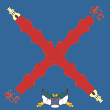 Keywords: royal regiment of artillery | real regimiento de artillería | artillery | cross: burgundy (red) | saltire: raguly (red) | lions: 2 (red) | castles: 2 (yellow) |