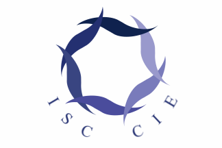 Commision’s flag: white, the logo placed in the centre above serifed dark blue acronyms "ISC SCI" placed in a bow. The logo itself is made up of six waves placed in a circle, the one at upper light being light blue and the others gradually (clockwise) becoming darker.