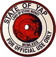 The seal of Yap shows a Yapese stone coin and the legends STATE OF YAP / OFFICIAL SEAL // LAND OF STONE MONEY / MCMLXXIX.