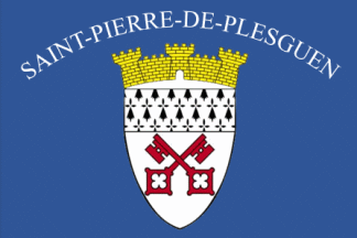 The flag of Saint-Pierre-de-Plesguen (photo, photo) is blue with the municipal coat of arms, "Argent, two keys gules [often reported sable] saltirewise a chief ermine", surmounted by the name of the municipality forming an arch.