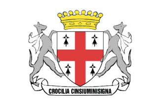 The flag of Le Croisic (photo, 2019; photo, 2016; photo, 2013; photo, 2010; photo, 2009) is white with the municipal arms. The representation of the arms on the flag is not at all the same as the one used for many years as the municipality's emblem. Moreover, the rendition of the coat of arms on the flag has an erroneous transcription of the motto, "Crocilia Cinsiuminisigna" instead of "Crociliacinsium Insignia" (Emblem of Le Croisic).