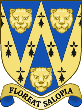 These arms were officially granted in 1896 and continued by the new authority in 2009. "The leopards' faces in these arms were adopted by the County Council in 1895 from the Borough of Shrewsbury. It is only in the incorporation of the ermine that the County arms differ from those of the Borough. The heads appear on the fifteenth century seal of the Corporation, but their origin is unknown. They may have been derived from the Royal Arms, or from the Arms of De La Pole, Earls of Suffolk in the fourteenth century (Azure, a chevron, and three leopards' faces Or), or arms of some local family. The heads are often referred to as 'the loggerheads'. This originates presumably in the practice of carving some such motif on the head of the log used as a battering ram."