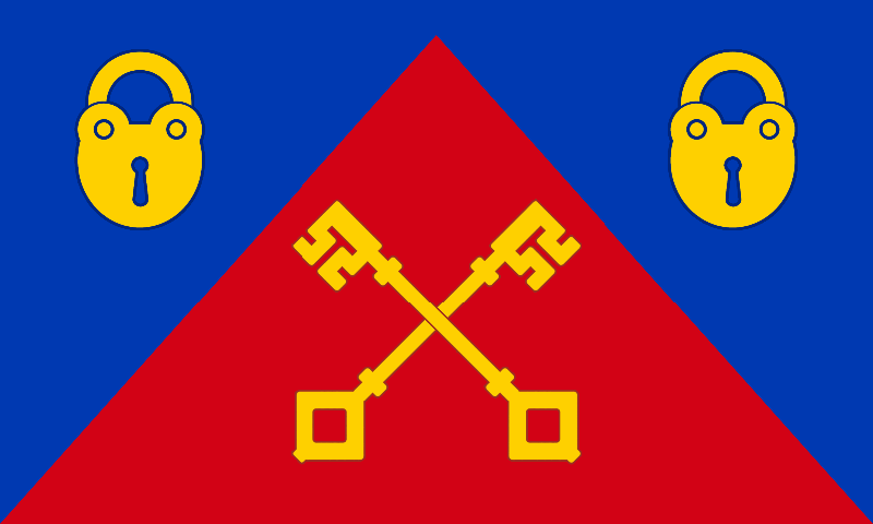 The flag features several references to the towns traditional industry of lock and key-making. The field itself is divided between a red hoist and a blue centre and fly by a vertical embattled line, the pattern of which symbolises the pins of locking mechanisms. In the hoist are three padlocks and the centre of the design has crossed keys with a crown above them, the crown recalling how Queen Elizabeth I granted permission to the town to manufacture royal locks and the towns subsequent status as a king of lock-making. The colours of blue, red and gold were drawn from the arms of the former Willenhall Urban District Council.