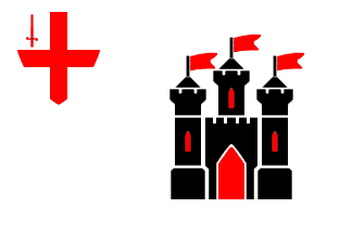 A white flag with an ogival shield with the London armorial bearings on the upper hoist and the Edinburgh armorial bearings on the middle fly.