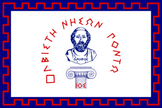 The flag is white with a dark blue bordure filled with red Greek key and on its center a mostly dark blue emblem consisting of a bust of Homer above an Ionic column and arched above it red Greek capitals reading ΟΛΒΙΣΤΗ ΝΗΣΩΝ ΠΟΝΤΩ (photo).