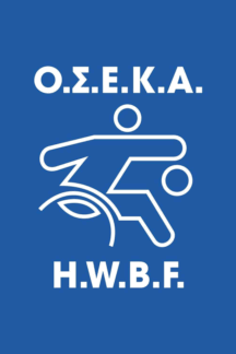 The flags of the Hellenic Wheelchair Basketball Federation are blue with the federation's emblem in the center.
