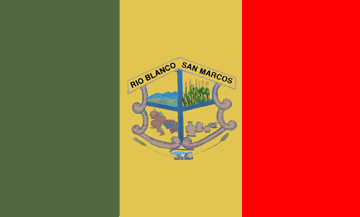 Río Blanco, San Marcos - According to photo at <www.inforpressca.com> - the flag is vertical green-yellow-red and charged with the Coat of Arms.