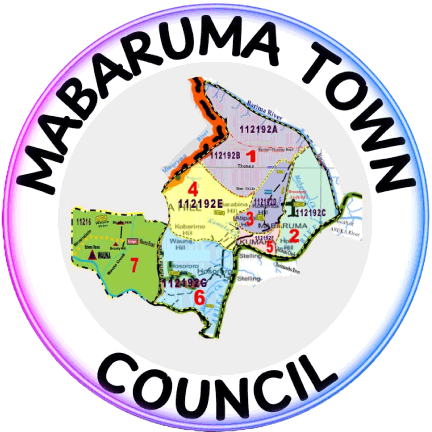 The current town logo appears to have been published this year. Its white outer ring reads in black "MABARUMA TOWN COUNCIL" (above) and "COUNCIL" (below). It is outlined in a gradient of purple/blue; white; and the same gradient. The center depicts a map of the town with its districts, having landmarks like hills and rivers.