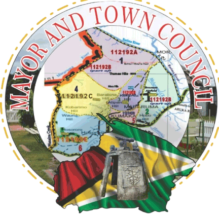 The previous logo depicted dashed gold lines outside of it, having in its outer ring "MAYOR AND TOWN COUNCIL" (above) in red outlined in white. A photograph of the town serves as its background. At the bottom, overlapping is a map of Barima-Waini (Region One) where it is located, having a waving flag of Guyana superimposed upon it outlined in black. Over it is the Mabaruma 100 Years of Progress monument unveiled by the President in 1990. In the center of the inner circle is an image of the town with its districts, having landmarks like hills and rivers.
