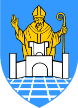 The coat of arms of the Municipality of Ston is shaped in Gothic form, on a blue background. In its middle there is a stylized representation of the forts of Stoviš and Koruna, in the base the salterns and at the top the figure of St. Blasius, in golden-yellow colour, holding in one hand a Gothic pastoral staff and blessing with his other hand.