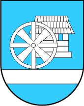 The coat of arms is described in Article 5 of the Decision, as " In blue over a silver (white) bar a silver (white) water mill."