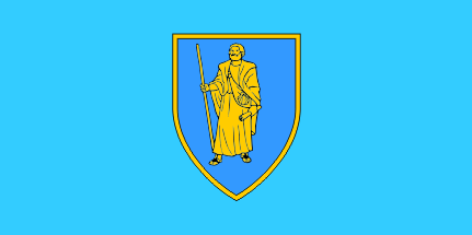 The coat of arms of the Municipality of Gunja is in a shield shape. On the blue background is a golden-yellow figure of St. James.The arms, "Azure St. James stantant holding a staff in his dexter and a scroll in his sinister and wearing a bag ensigned with a scallop all or", refer to the St. James church, built in Gunja in 1849. The scallop on the bag is the traditional ecclesiastic attribute of St. James.