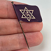 WW1 Zionist cause flag pin badge. Gold print on dark brown field. Obverse: Star of David with centered
