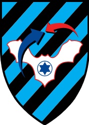 The insignia, a bat, is derived from the latest acquired German radar called Superfledermaus (Super Bat). The incoming red arrow symbolizes any projectile headed to the country being countered with an outgoing blue arrow directly towards it. When the Unit was transferred to the Air Force in 1970, diagonal stripes (blue and black) were added in order to symbolize [cooperation] between the Air Force and the land forces. The latest insignia was designed in 2011 by graphic designer Yigal Gabbay.