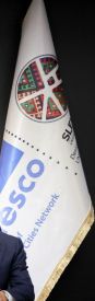 The flag started to be used sometime in the year 2023 (or very last months of 2022). It depicts a blue-and-white version of the UNESCO logo, reading underneath "unesco" and "Member of Creative Cities Network". To the right, the Slemani governorate logo is depicted with the text Designated UNESCO Creative City in 2019 underneath.