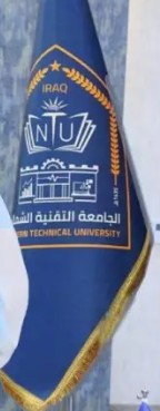 The logo of Northern Technical University has a golden border shaped as a dome. At the bottom is Northern Technical University in Arabic (white) and in English (gold). The background of this logo is blue. To the sides are golden branches, curved and pointing to a star. Underneath this star is IRAQ in gold. Underneath them is a symbol and years of foundation; to the left 2014 in the regular calendar and to the right 1435 as the Hiriji year of its establishment, both in white. In the center: above is an open book reading its initials of N and U on its pages, stylized to show more pages. In between the two pages is a stylized torch of enlightenment; below: a castle depicting a graph rising (left) on its tower; a computer screen with symbols emerging (right) on its tower; in the center a depiction of a monitor; and above this two cogwheels. These show the mission of the university.