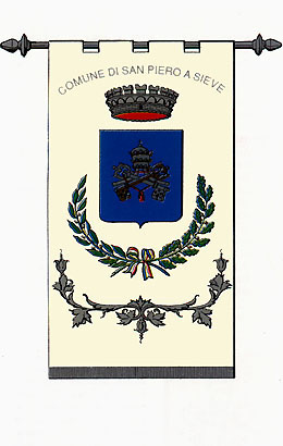 "GONFALONE. Drappo di colore bianco riccamente ornato di ricami d’argento e caricato dello stemma sopra descritto con la iscrizione centrata in argento: Comune di San Piero a Sieve (Decreto del Presidente della Repubblica in data 27 luglio 1987).