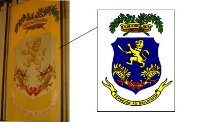 Here is an image and photo of the flag (gonfalone) of the province of Frosinone. This flag was approved by Regio Decreto (= Royal Decree) on 14 July 1928 and was registered by Consulta Araldica (= Heraldic Council) on 21 July 1928. The description of the flag is on Art.2 of the Statuto (= Statute) of the Province of Frosinone. This flag is a combination of the symbols of the two territories that was united in 1928 as the Province of Frosinone: the golden lion is the symbol of the City of Frosinone, formerly in Province of Rome, and the horns with fruits and corn was the standard of Terra di Lavoro (=Land of Labour), the southern part of the province that was in Province of Caserta since 1928.