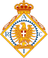 The 1927-1933 (other sources mention 1934) pennant is featured above. It displays the 1927-1933 logo, which is in the shape of a rhombus, depicted a golden eagle with the Savoy cross, all inscribed in a toothed wheel over a blue pennant together with the "tricolore", with new acronym RACI and the royal crown appear in the logo.