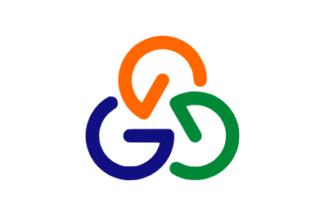 The city emblem was adopted on Feb 1st 2005 by Notice No 2 but there is no flag law. The white flag has an orange, a green and a blue three color city emblem in the center. The city emblem is three stylized hiragana の No of Nomi in a form of combined circles and a triangle. The orange color stands for a famous Japanese pottery Kutani ware, the green color for mountains and the blue color for a sea. It represents a gentle and a simple image of the city and a  development of the city which owns a wealthy of resources such as a nature, a history, a culture.