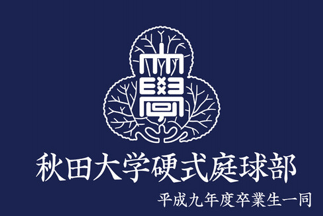 Hardball tennis club: The club flag has dark blue background with a white university emblem and horizontally written kanji university and club name in white.