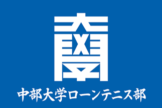 Lawn tennis club; The club flag has blue background with a white symbol mark with kanji letters 大學 and horizontally written kanji university and club name in white.