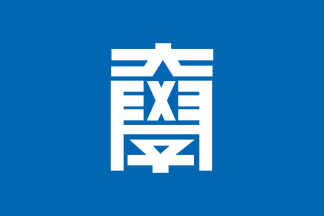 The university flag has blue background with a white symbol mark and white kanji university name horizontally written. (Source)