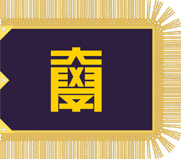 The embroidered ceremonial flag has purplish blue background with a gold symbol mark in gold fringe.