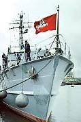 A new jack has also been adopted; it is white with a circular badge showing a stylized yellow castle on a red field, with a dark blue anchor behind the badge. Proportions" 1:2.