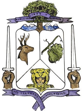The council informed me they do not have information regarding their municipal coat of arms, but it appears based on comments online that it was created by the teacher Jorge García. It is unclear if it is still used today, as the Administration of 2024-2027 uses a different logo. It depicts, to its sides, two hands holding swords for the strength of the people. Under it is a ribbon that reads "SAN FERNANDO, CHIAPAS, MEXICO." Above the shield, mountains and a tree are depicted for its geography; a ribbon is also seen which reads "MUNICIPIO LIBRE Y SOBERANO" [Free and Sovereign Municipality]. The shield is divided into two halves with a triangle at the bottom. The left section depicts a deer for its fauna. The right half depicts a pear growing from a branch, symbol of fruticulture. The lower section depicts a man in a tiger suit, representative of the Dance of the Tiger, a local Zoque cultural tradition.