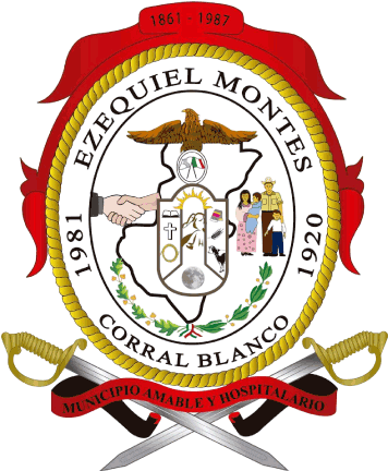 The Official Coat of Arms of Ezequiel Montes is framed by an oval which has the figure of being ixtle rope, traditional artisanry of the Villa Progreso Delegation, furthermore of being an emblem of charrería in the municipal seat. This oval encloses the names of the town and the years in which it obtained officially the denomination "1861 Corral Blanco" and "1920 Ezequiel Montes", legend inscribed over a second oval. In the center of this geometric figure, the map of the State of Querétaro is drawn in which various elements that characterize the Municipality of Ezequiel Montes are observed. Of this form, in the middle of the map, an open door of two pages which is crowned by rays of the sun is visible. Since remote times, for many cultures, the sun and its rays have been a symbol of life. In the left page of the door, education, culture, and technology is represented as present in the municipality [open book, cross, ixtle rope]. On the right page, agriculture, artisanry, and cattle-raising are represented [ear of wheat, blanket, cow]; this last one being the principal economic activity in the Municipality.