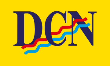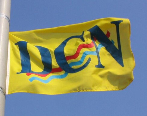 The flag is a yellow horizontal background with the company's initials in the middle in blue capitals over two wavy lines in red (top) and blue (below).