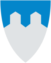 Delt av blått og sølv ved gråverksnitt (med to spisser oppover). In English: Per fess urdy azure and argent, two points to the chief.