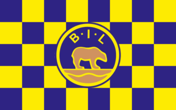 The flag of Bjørnevatn IL (Bjørnevatn Idrettslag) from Bjørnevatn in Sør-Varanger Municipality is blue or chequered blue and yellow with the badge centered.
