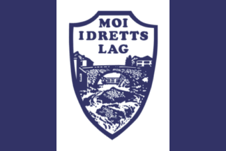 The flag of Moi IL (Moi Idrettslag) from Moi in Lund Municipality is a vertical blue-white-blue triband with the badge centered.