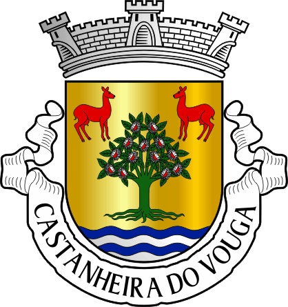 Shield Or with base wavy of Azure and Argent, an eradicated chestnut tree Vert, fruited Gules shelled Argent, in chief two she-roes respectant Gules. Mural crown Argent with three visible towers (village rank) and white scroll with inscription in black initials "CASTANHEIRA DO VOUGA".