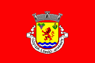 Shield Or with base wavy of Azure and Argent, a lion rampant Gules, in chief a grapevine Purpure at dexter and a corn cob Or at sinister, both leafed Vert. Mural crown Argent with three visible towers (village rank) and white scroll with inscription in black capitals "GOUVEIA - S. SIMÃO - AMARANTE".
