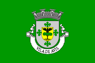 The coat of arms has a 4-towered mural crown, a scroll reading "VILA DE AVIS" (see right flag image above)