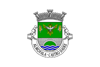 Shield Vert with base wavy of Argent and Azure, issuant from base wavy a throughout bridge Argent masoned Sable, on chief a dove Argent with nimbus Or, flanked by two corn cobs Or. Mural crown Argent with three visible towers (village rank) and white scroll reading in black upper case serifed letters "ALMOFALA – CASTRO DAIRE".