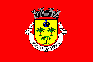 Shield Or three cork oaks eradicated Vert peeled Gules ordered 2:1, on chief a Marian crown Azure. Mural crown Argent with four visible towers (town rank) and white scroll reading in black upper case serifed letters "SOBRAL DA SERRA".