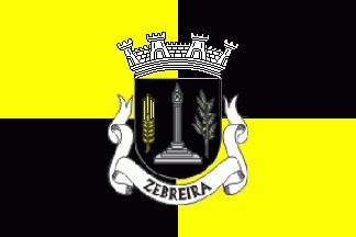 The arms are Sable, in centre a pillory Argent lined Sable flanked by a wheat ear Or (dexter) and an olive branch Argent fruited Or (sinister) . Mural crown Argent with four visible towers (town rank) and white scroll reading "ZEBREIRA" in black upper case letters.