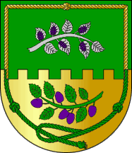 Shield Vert on a wall embattled Or issuant from base a plum tree branch Vert fructed Purple, in chief a mulberry branch Argent fructed Purple with its proximal end at the sinister, in orle a Franciscan cordon counterchanged. Mural crown Argent with four visible towers (town rank) and white scroll reading in black upper case letters "SANTA CLARA - LISBOA".