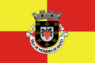 The arms are Argent a bunch of grapes Gules leaved and trunked Sable and on a bordure Sable eight bees Or. Mural crown Argent with four visible towers (town rank) and white scroll reading in black upper case letters "VILA DE MONDIM DE BASTO".