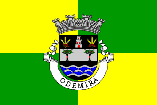 and white scroll reading in black upper case letters "VILA DE ODEMIRA" (see left image above)