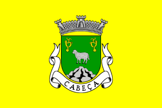 Shield Vert, in base a snowy mountain issuant, above a couped sheep Argent, in chief a pair of spurs Or, one spur in each corner. Mural crown Argent with three visible towers (village rank) and short white scroll, in Bénard Guedes style, reading in black upper case serifed letters "CABEÇA".