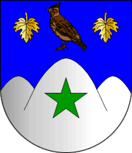 Shield Azure a mound Argent charged with a 5-point estoile Vert, in chief a lark Proper flanked by two wine leaves Or. Mural crown Argent with three visible towers (village rank) and short white scroll, in Bénard Guedes style, reading in black upper case serifed letters "VIDE".