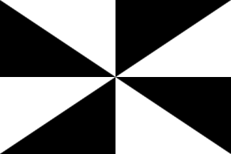 It is a quite typical Portuguese municipal flag, with the coat of arms centred on a gyronny background (city rank) of white and black.