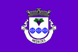 Shield Argent three heraldic fountains in fess slightly abased, on central chief a grape bunch Purpure leafed Vert. Mural crown Argent with three visible towers (village rank) and white scroll reading in black upper case serifed letters "MEDRÕES".